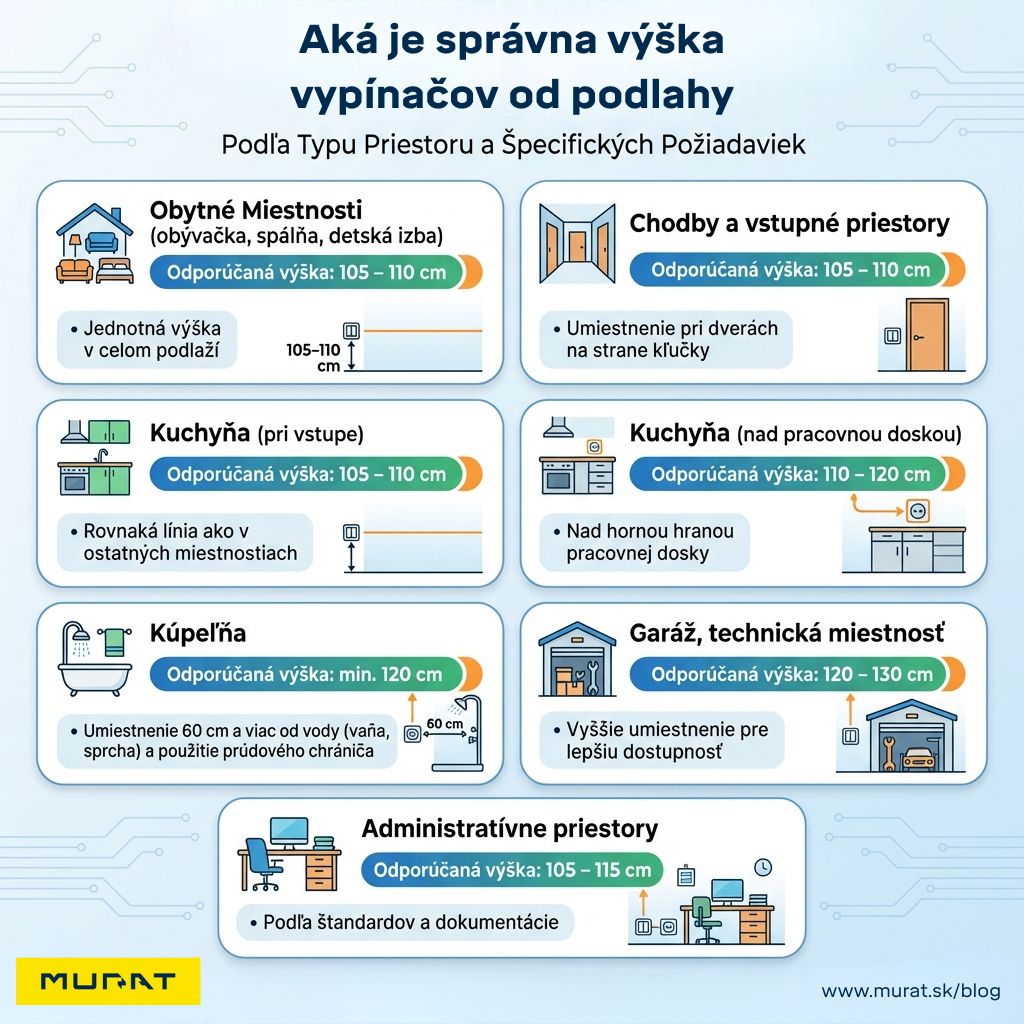 Hoci norma poskytuje všeobecné rozmedzie, konkrétna výška vypínača od podlahy sa v praxi líši podľa typu stavby a účelu miestnosti. V nasledujúcej tabuľke nájdete osvedčené hodnoty z praxe.