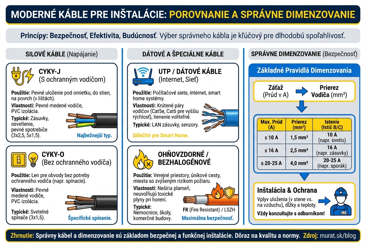 Pre rýchly prehľad a porovnanie najrozšírenejších silových káblov v nízkonapäťových inštaláciách, sme zhrnuli všetky najdôležitejšie informácie do tabuľky.